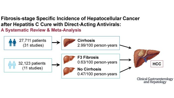 A systematic review and meta-analysis, published in Clinical Gastroenterology and Hepatology, assessed HCC incidence or outcomes by cirrhosis status and fibrosis stage, in adults with HCV who achieved sustained virologic response after direct-acting antivirals (DAAs).