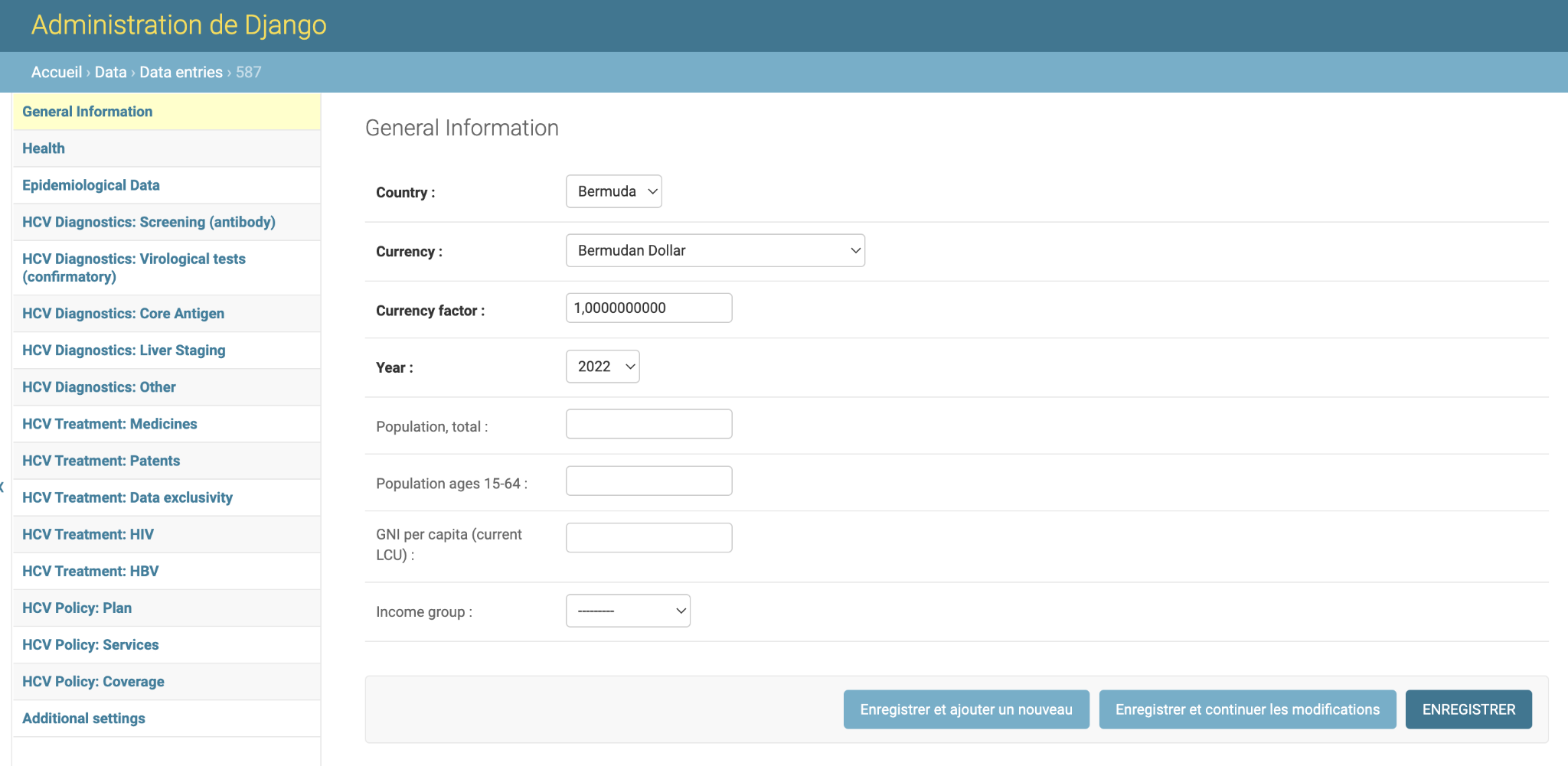 Cliquez sur « data entries » pour vérifier toutes les entrées de données affectées au(x) pays dont vous avez la permission de modifier. Vous verrez qu’il existe déjà une entrée de données de 2021 pour chacun des pays que vous avez la permission de modifier. Il s’agit d’informations qui figurent déjà dans la base de données, vous n’avez donc pas besoin de les modifier.